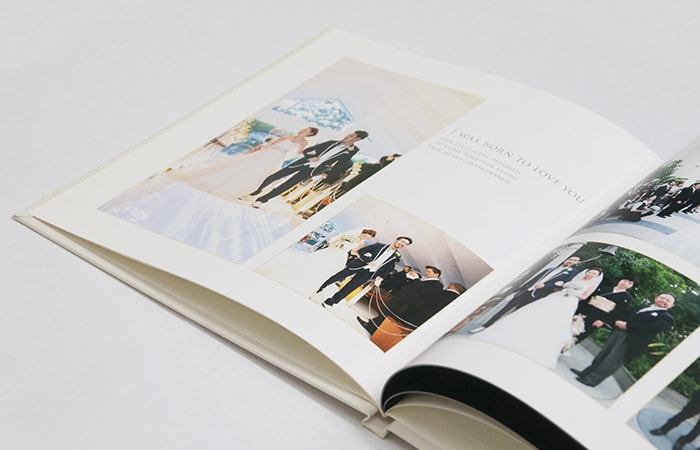 厚みのあるしっかりした製本の結婚式アルバムで、表紙、中面ともに光沢があり、当日の思い出を鮮明に残せます。 - シンプルなデザイン